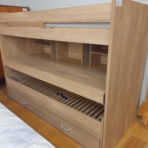 Incl. lattenbodems, 1 uitschuifbaar ruim bureau, 1 opberglade voor extra matras
