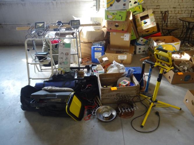 oa. werflampen, trapladder, fietspompen, verrijdbare kar, aanhangernet, ...