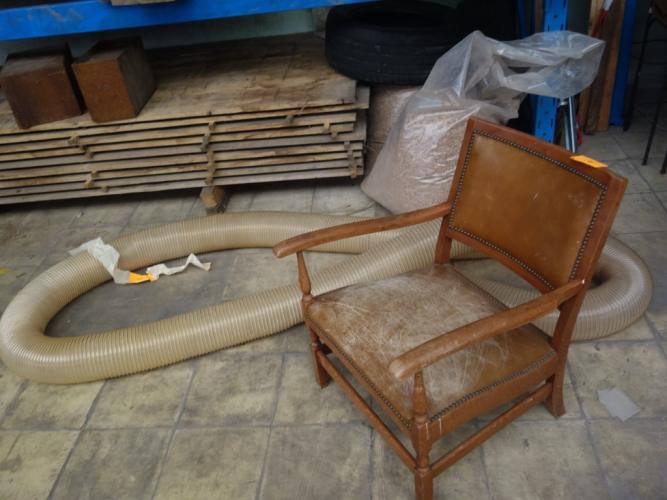 houten stoel , metalen, afzuigslang , 2x autoband , houtzaagsel