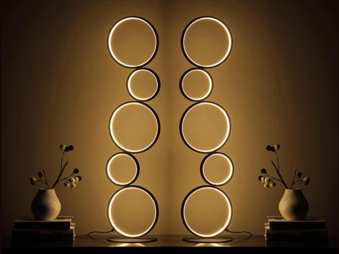 Product eigenschappen: Aantal lichtbronnen: 5. Afmeting ca.: 1200 mm x 380 mm x 200 cm .Lichtbundel ca 145 graden. Lichtkleur: Warm wit Aansluiting: 230 Volt. Kleur: Zwart. Deze bijzondere vloerlampen geven een unieke uitstraling en kunnen in meerdere ruimten worden gebruikt zoals in de woonkamer, in slaapkamers, in studeerkamers of speelkamers, maar ook in werkruimten, ontvangstplekken of in de showroom. De lamp is voorzien van 5 cirkels met een onafgebroken opalen led lichtbron welke een uniek en tijdloos licht effect geeft. De lampen voelen zich zowel goed nabij een muur, in een hoek maar ook vrijstaand. Dit betreft een nieuw product