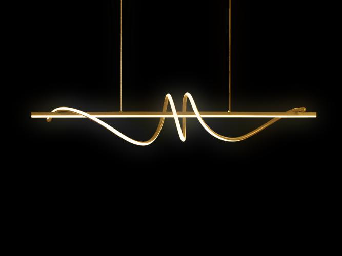 Dit bijzondere design armatuur geeft een unieke uitstraling en kan in meerdere ruimten worden gebruikt zoals in de woonkamer, in het tuinhuis, onder de luifer, maar ook in slaapkamers, studeerkamers, werkkamers of in ontvangstruimten. De lamp is voorzien van een onafgebroken opalen led lichtbron welke een uniek en tijdloos licht effect geeft. De montage is eenvoudig en kan dankzij de lichtgewicht eigenschappen snel plaats vinden, dankzij de flexibele ophangset is de lamp eenvoudig in hoogte te verstellen en te positioneren. Het kleur van het licht is een zeer aangenaam warm wit en past goed in alle gebruikte ruimtes. Product eigenschappen: Aantal lichtbronnen: 1. Afmeting ca.: 1200 mm x 250 x mm x 1200 mm. Lichtbundel ca 170 graden. Licht sterkte 47 Watt: Lichtkleur: 3000K Warm wit. Aansluiting: 230 Volt. Kleur: Goud. Dit betreft een nieuw product