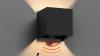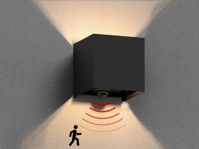 Deze bijzondere wand spots passen goed aan zowel een modern als klassiek huis en kunnen aan de voorgevel, de achtergevel, de tuinafscheiding, onder de overkapping of aan het tuinhuis worden gebruikt. Het licht van deze prachtige wand spots schijnt niet alleen naar boven en naar beneden, maar kan zowel naar boven als naar beneden breder en smaller gemaakt worden. Zo kun je zelf creatieve lichtpatronen maken die in iedere ruimte net even anders zijn. De armaturen zijn voorzien van een bewegings detector en voorzien van een duurzaam spatwaterdicht led lampje met een warm witte lichtkleur en een sterkte van 8 Watt Led. De wandlampen zijn eenvoudig te monteren en geschikt voor alle vochtige maar ook droge alle ruimtes in huis: Afmeting: ca 10.5 x 10.5 x 10.5 cm. Kleur: Zwart., Afwerking mat. Spatwaterdicht: Ja, IP54, Type: Wand armatuur, met bewegingsmelder, PIR detectie: ca 5 m. Lichtkleur 3000K, warm wit. Verstelbaar: Ja.