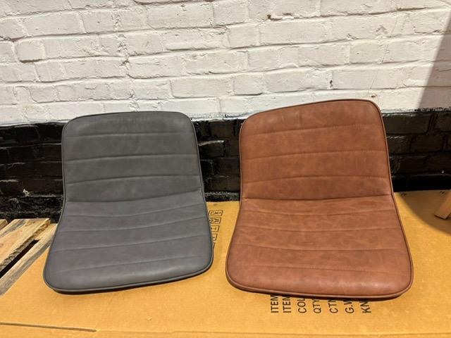 Lot van ca 150 zittingen voor barstoelen in lederlook, 70% cognac, overige grijs en bruin, af te halen op afspraak regio 9620