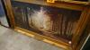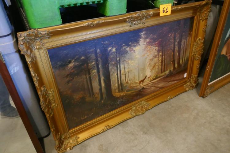 Vintage schilderij op doek met een sierlijke houten goudkleurige kader - landschap woud met herten