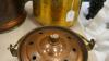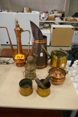 Koperen decoratieve items : koffiekan - koolbak - kookpot - emmer - obussen olielamp