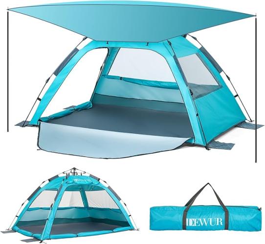 Gebruikssporen, volledig, kleine scheurtjes in luifel (zie foto's), Dewur Strandschelptent voor 2-4 personen, pop-up strandtent met zonnezeil, UPF 50+, uv-bescherming, zonwering, waterdicht, voor gezinnen, strand, camping, tuin, blauw, B0CS3NVKC2