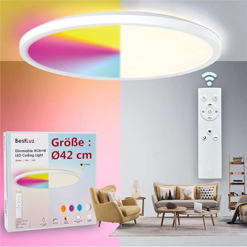 Ongebruikt, getest en werkend, ok, BestLuz Led-plafondlamp, ledpaneel, plafondlamp, diameter 42 cm, 24 W, RGBW + neutraal wit, 4000 K, met achtergrondlichteffect, afstandsbediening, voor badkamer, slaapkamer, woonkamer, keuken,B0B74K15LF