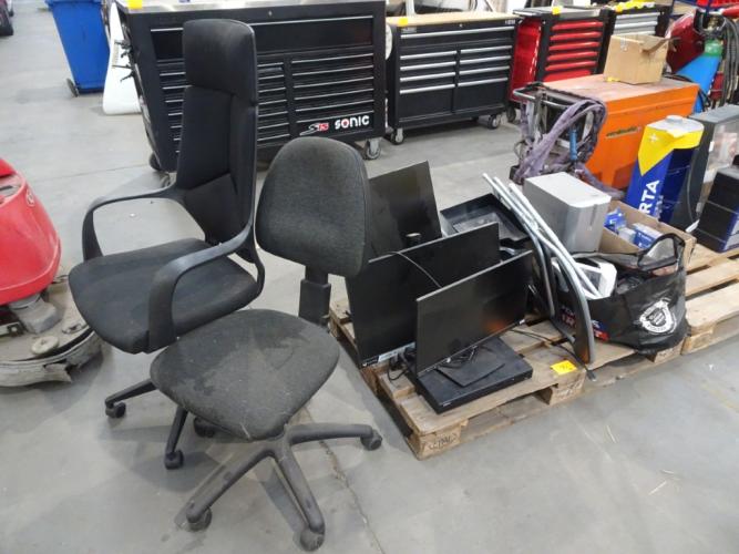oa 3 schermen, 2x bureaustoel, subwoofer JVC, ...