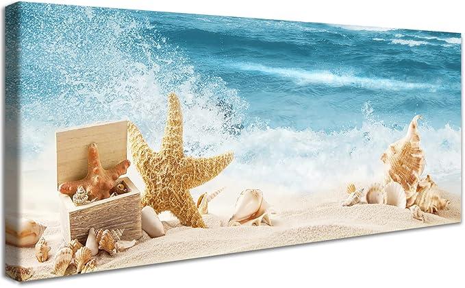 Ongeopend, Houten omlijsting Zeester in een doos Zeegolf Canvas Wandkunst Kust Zandstrand Zeegezicht Schilderij op Canvas Afdrukken Poster Foto's voor Woonkamer Slaapkamer Restaurant Huis Muurdecoratie 50x120cm/20x48 inch, B0D9NG54R3