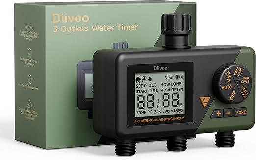 Ongebruikt, getest en werkend, volledig, ok, Diivoo Bewateringscomputer met 3 uitgangen, programmeerbare tuintimer voor weekdagen, automatische regentimer, handmatige/automatische gazonmodus, B0CPJG8QJ1