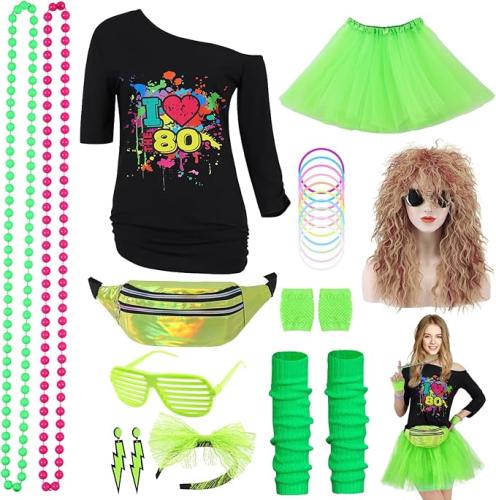 Ongeopend, ok, Geplaimir Jaren 80-outfit voor dames, neonkostuum voor dames, carnavalskostuum jaren 80, themafeest, outfit, kleding met neonaccessoires voor carnaval, Small, B0DPNF4PXH