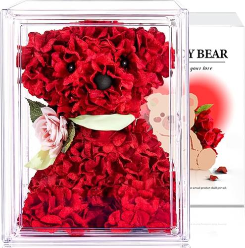 Ongeopend, licht beschadigde verpakking, Aloskart Bloemen-beer met rozen, incl acrylic doos, zijdestof 25cl hoog , B0D9Q1V8X1