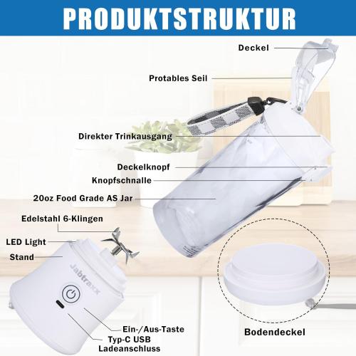 Ongeopend,Jabtraxx Draagbare 600 ml blender, mini-smoothiemixer, oplaadbaar, USB, sterke snijkracht met 6 ultrascherpe messen, wit, B0C4H8Y634