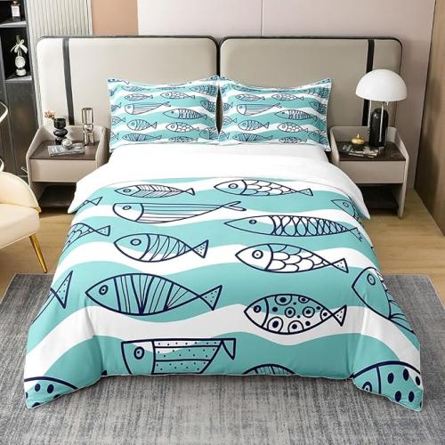 Ongeopend, in seal, Homewish Dekbedovertrek met cartoon vissen, 135 x 200 cm, geometrische vissen, 100% katoen, dekbedovertrek voor jongens, mintgroen en witte strepen, beddengoedset, B0CD7RL959