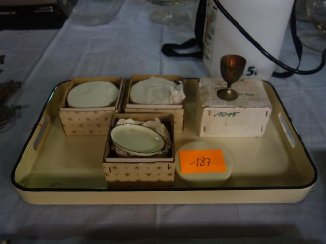 Dienblad, onderleggers (3 x 6 st) en 6 eierdopjes