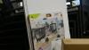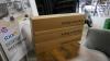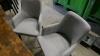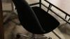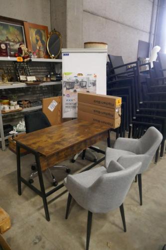 Bureautafel - 2 bezoekerszetels, grijze stofbekleding - verrijdbare bureelstoel, zwarte stofbekleding - magneetbord - vergaderbord + rollen papier