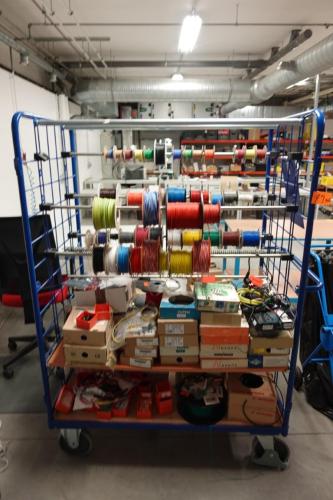 Verrijdbare magazijnkar + inhoud elektrische kabels