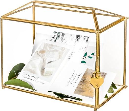 Ongebruikt, ok, compleet, NCYP 26 x 15 x 20,3 cm - Glazen kaartdoos met sleuf en slot, kleine geometrische decoratieve doos voor bruiloft, feestreceptie, donatie, aandenken, goud, handgemaakt (alleen glazen doos), B0812Z7M4L