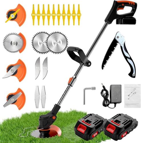 Minieme gebruikssporen, getest en werkend, ok, Gompuy Accu-grastrimmer, elektrische grastrimmer met metalen lemmet, accu-grastrimmer met 2 batterijen van 21 V 2000 mAh, intrekbare handgreep en 90° rotatie van de kop,B0DQP565KT