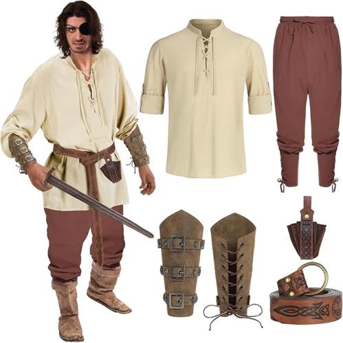 Ongeopend, Geplaimir Middeleeuws kostuum voor heren, Viking, renaissance, victoriaans, piraten, steampunk, cosplay, veterhemd, top met accessoires, Vikingbroek, PU-leder, O-ringriem, Large , B0CMV6CJ4P