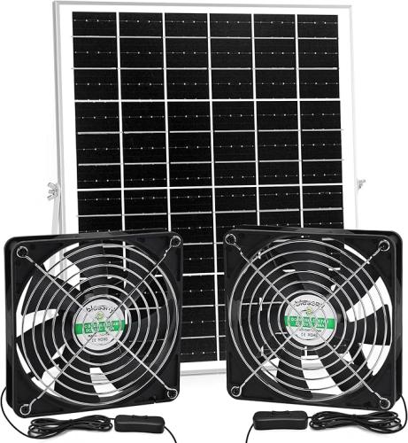 Minieme gebruikssporen, getest en werkend, ok, Blessny Ventilatorset op zonne-energie, 5,5 inch, 25 W zonnepaneel met 2 waterdichte ventilatoren voor kippenhokken buiten, broeikassen, schuren, toevoerlucht of afvoerlucht, met 4,5 m kabel, B0DSZY1KY7