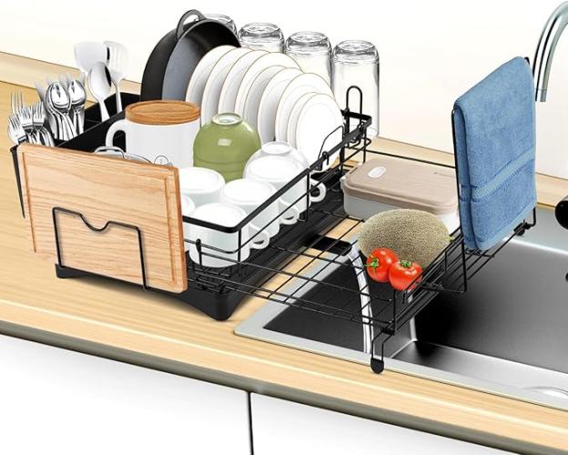 Ongeopend, Afdruiprek voor servies met afdruipbak, afdruiprek van roestvrij staal, uitbreidbaar afdruiprek, afdruiprooster voor spoelbak met gebruiksvoorwerpenhouder, snijplankhouder, bekerhouder, B0D226FL55