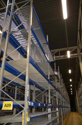 Hoogte=6000mm. 13 staanders. 88 liggers lengte=2700mm. Voorzien van roosters en aanrijbeveiliging.