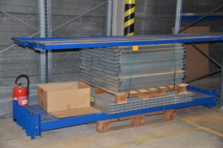 72 metalen legplankjes. 4 roosters. 1 staander lengte=6000mm. 3 kopse aanrijbeveiligingen.