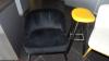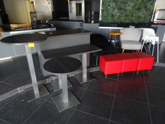 Oa. 3x bistrotafel, 1x hoge tafel, 3x poef in leder, barstoel, ...
