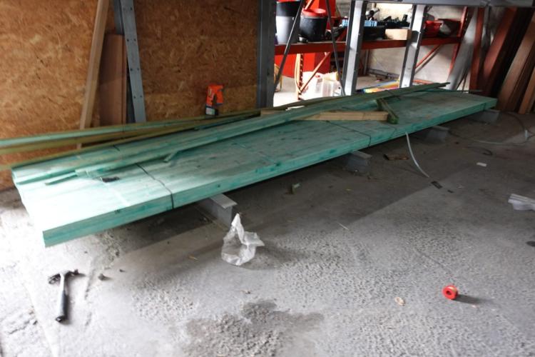 oa: gedrenkt hout, pannenlatten, planchetten, osb platen,... samen met restpartij tegen muur en 2x pallet diverse platen op verdiep