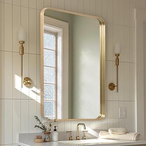 Ongebruikt, volledig, ok, Melodieux Gouden badkamerspiegel voor muur, 50 x 75 cm, metalen frame, wandspiegel, rechthoek, decoratieve spiegel voor slaapkamer, woonkamer, entree, horizontaal of verticaal, B0CYYND8MF