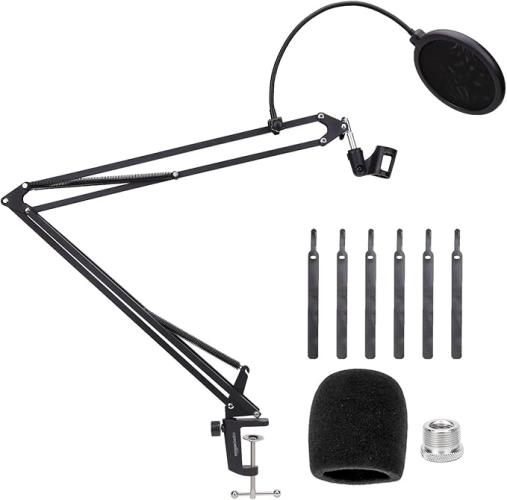 Ongebruikt, ok, Amazon Basics Verstelbaar microfoonstatief, met popfilter en schuimrubberen windscherm, tafelklem, 360° draaibaar, compatibel met Blue Yeti, Snowball, HyperX, 48,2 cm (19 inch), zwart, B0B1Q6R3TF