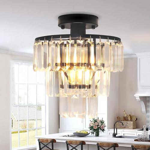 Ongebruikt, getest en werkend, compleet, JHLBYL Moderne kristallen plafondlamp, 1-vlam zwarte metalen kristallen kroonluchter, industriële kristallen plafondlamp met E27-fitting voor keuken, badkamer, veranda, B0CJHZVXWN