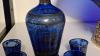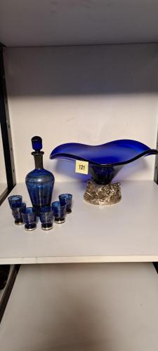 blauw glazen kom en karaf met 6 glazen
