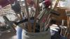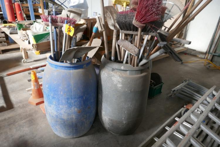 Plastieken tonnen met allerlei opkuisgerief : borstels - trekkers - spade's - tuingereedschap - enz..