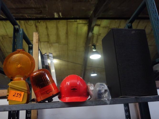 2 zwaailichten, helm, stofmasker en veiligheidsbril