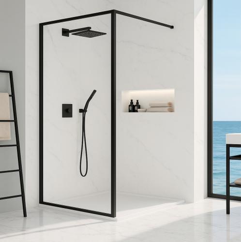 1 x 140 x 200 - Antikalkbehandeling - NANO-EASY CLEANING GLAS; B 1360 x H 2000 mm - Mat zwart kader profiel breedte 25 mm - Mat zwart muur profiel breedte 30 mm - Veiligheidsglas Glasdikte 8 mm - 100 cm mat zwart stabilisatiestang inclusief - 140BCF