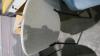 2 metalen eetkamerstoelen in grijs stoffen bekleding