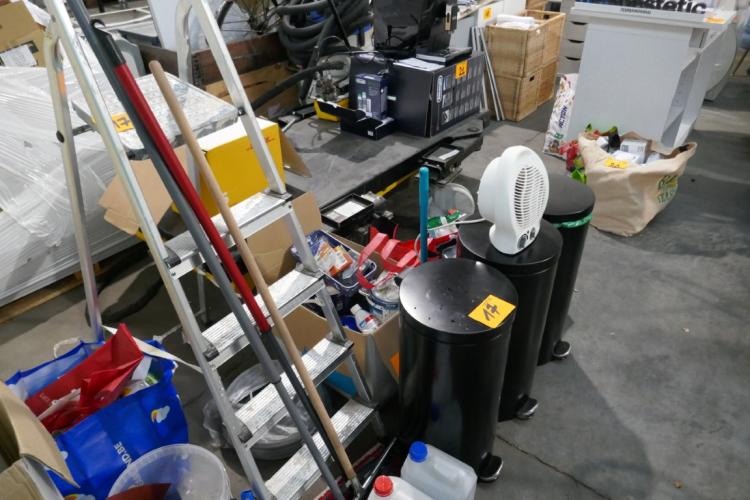 Diverse items : 3 vuilbakken met voetbediening - verwarmingselement - trapladder - poetsmateriaal - baloncylinder - schildermateriaal - bidons gedemineraliseerd water