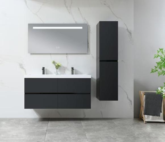Badkamermeubel 120 cm - Hoogglans zwart + witte dubbele wasbak - Incl. kranen