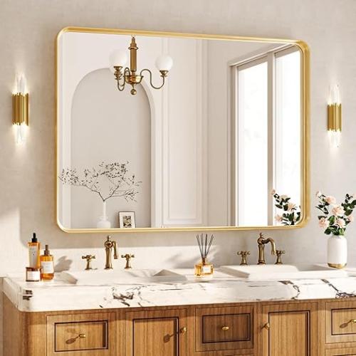 Ongebruikt, ok, vijzen en pluggen ontbreken, Koonmi wandspiegel (120 x 90 cm), luxe high-end rechthoekige badkamerspiegel, gefileerde hoeklijst, spiegel, horizontaal of verticaal opgehangen, goud, B0DLVWJHC2