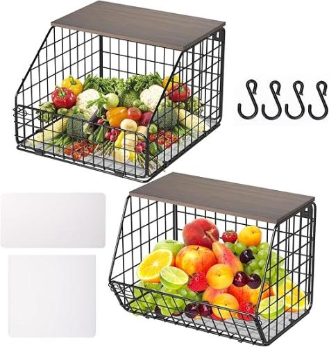 Ongebruikt, ok, Bimiti Hangende fruitmand (2 stuks), etagère, fruitmand aan de muur voor keuken, keukenorganizer met houten deksel met 4 bananenophanghaken, stapelbare groentemand voor het bewaren van fruit, B0CYQ77SC7