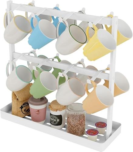 Ongebruikt, volledig, ok, YUMORE Koffiemok houder standaard, 16 kopjes haken aanrecht mok boomhouder rek met opbergbasis 2 niveaus toonkopjes mokken display opslag organizer voor keuken thee koffiebar, wit, metaal, B0DKXCTTZX