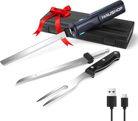 Ongebruikt, getest en werkend, compleet, HAUSHOF Elektrische Messenset 8V, Draadloos Keukenmes met Roestvrijstalen Bladen, 2000 mAh Accu voor Nauwkeurig Snijden van Brood, Vlees en Kaas, met Opbergdoos, Grijs, B0D21TTS8B