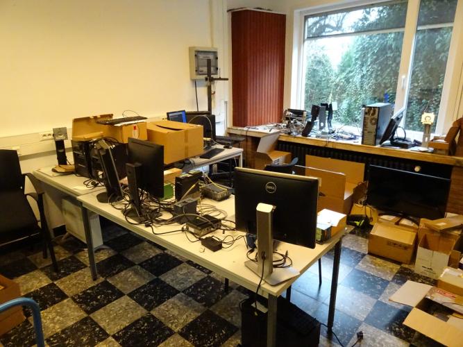 IT materiaal, computers, printers, schermen, bureau, ... (alles moet mee)