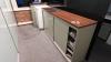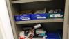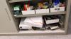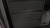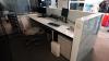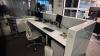 Bureau 2860x1140x1150/750 mm glazen blad + alu onderstel en 2x alu bureaukastje, 2x DELL PC scherm, toetsenbord, bureaustoel, versnipperaar, frigo, glazen kastje op wielen, opbergkast 1860x980x450 mm, metalen klasseerkast, divers bureaumateriaal, elektrisch vuurtje +++ alles moet mee