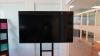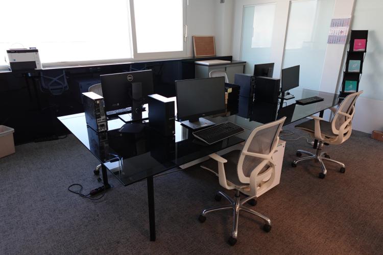 Bureautafel 3370x1570x780 mm met glazen blad en alu onderstel, DELL TV scherm 1240x720 mm op statief met wielen type C5519QA, 4x bureaustoel, 3x bureaukastje, 4x PC met scherm, Kyocera printer, alu folderrek dossierkast 1220x450x980 mm +++ alles moet mee