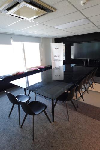 Bureau 3370x1570x780mm, 12x kunststof stoel, DELL TV scherm touch 1520x890 mm op statief met wielen type P6524QT, clipboard, +++ alles moet mee