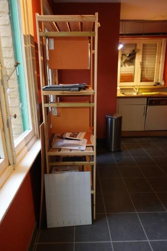 oa: Friteuse, koffiezetmachine, houten rek, tassen, borden, frigo, vuilbak...