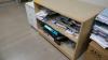 Verrijdbare houten wandkast met inhoud ( kaften + papierbakjes )